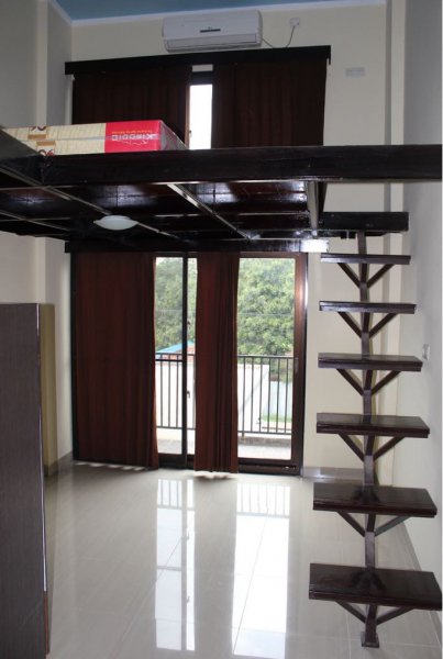 Tersedia 16 unit tipe kamar Studio Mezaiennine, ukuran 3×7.5 M, tinggi ceiling 4,5 M, sehingga menjadi ruangan 1,5 lantai, lantai