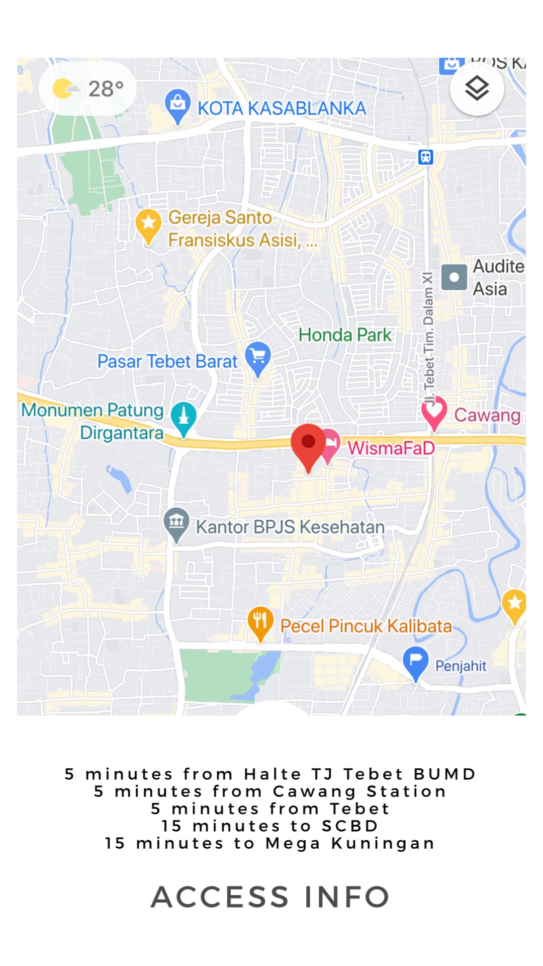 Deket banget st. Cawang, jembatan nyebrang ke tebet, halte busway tebet bumd. Tempat makan banyak 24jam. Parkir motor ada.