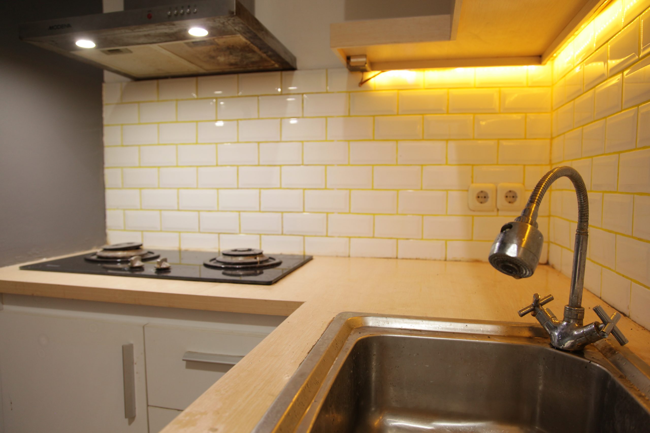 -Dapur bersih, kompor tanam, cooker hood, kitchen sink, dan kulkas.