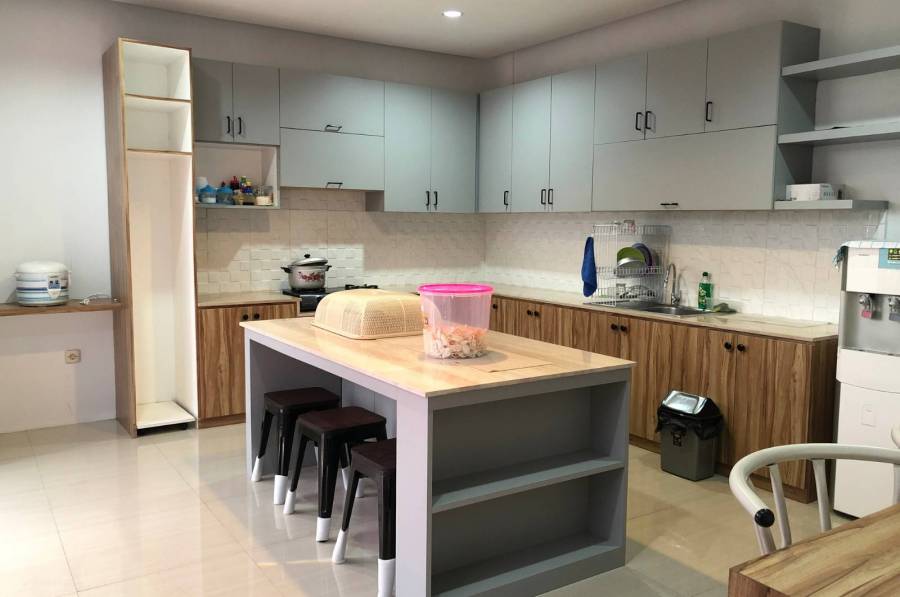 – Dapur dengan kulkas, dispenser, alat masak dan meja makan