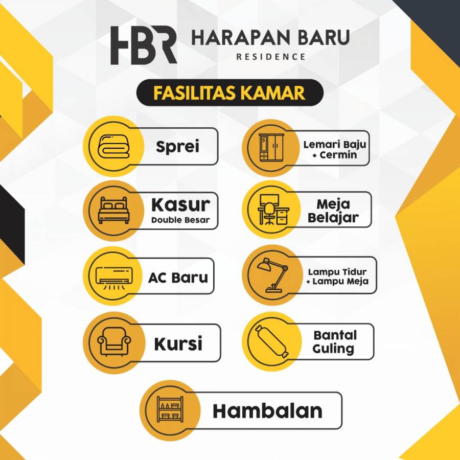 Kost Harapan Baru 3 Residence (Kost HBR) merupakan Kos PUTRI yang BARU diRenovasi TOTAL. Kost yg Nyaman dengan semua Perabotan BARU, bahkan ACnya juga BARU.