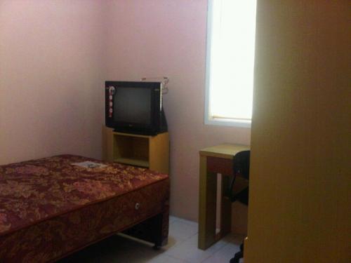 Fasilitas: Spring bed, kamar mandi dalam, lemari pakaian, meja + kursi kerja, AC, TV, cuci gosok.