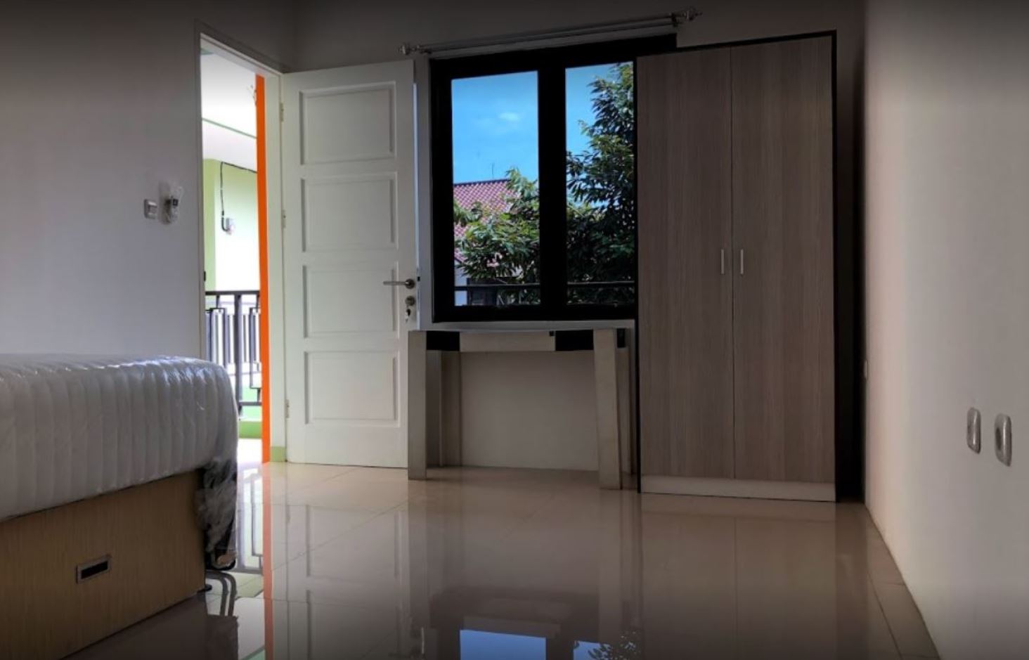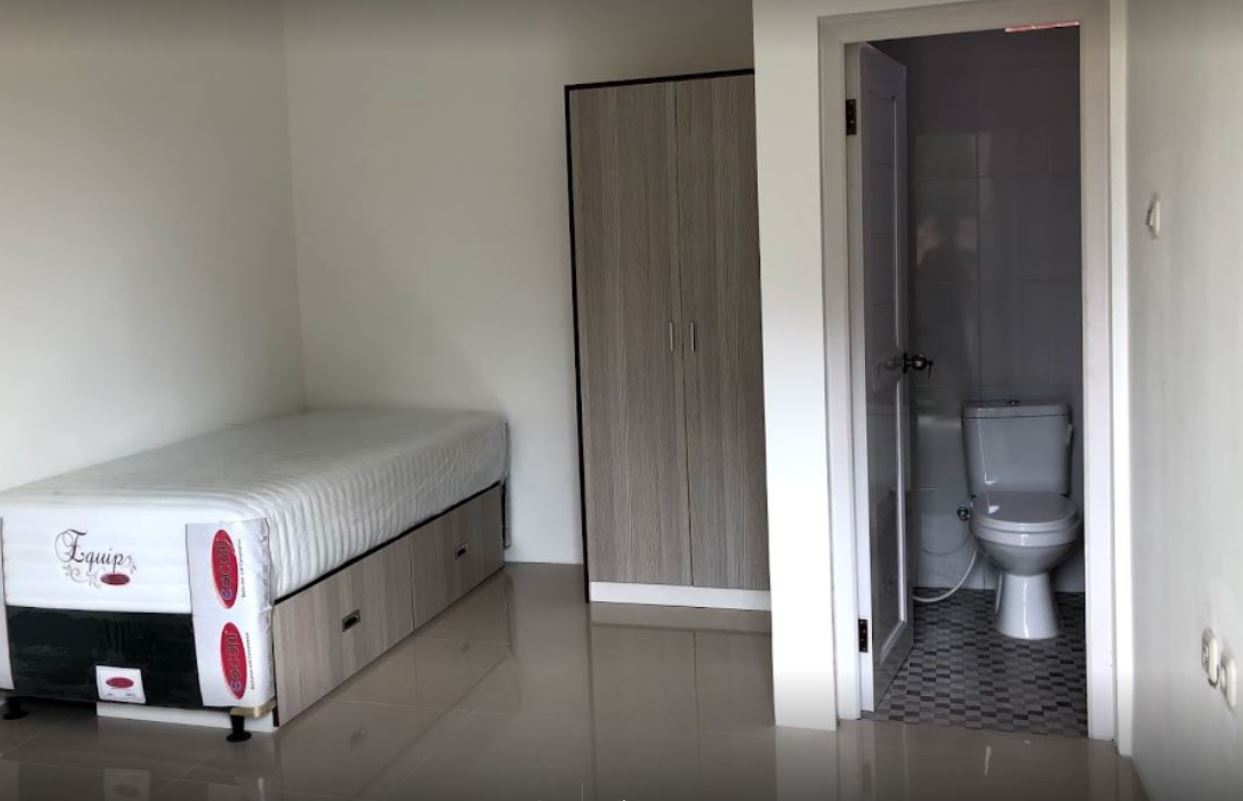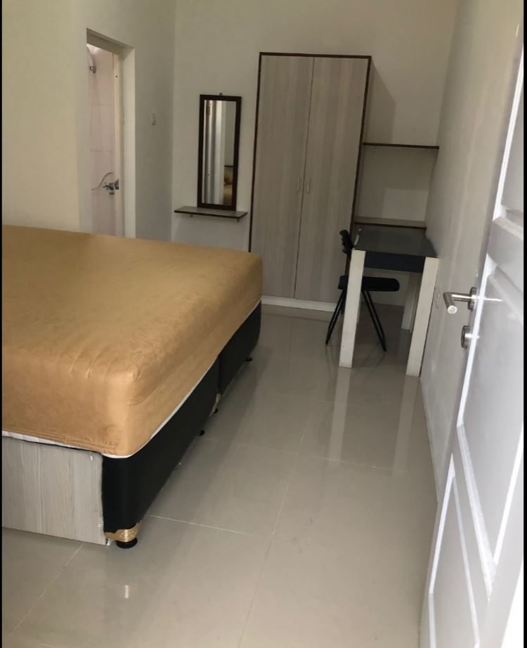 Kamar sudah lengkap (lemari, meja, sprigbed, kaca cermin), termasuk seprei dan bantal